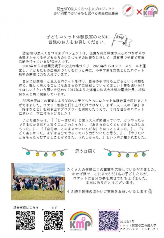 今年も、ロケット教室専用の赤い羽根募金箱をおいていただける所を募集しています。